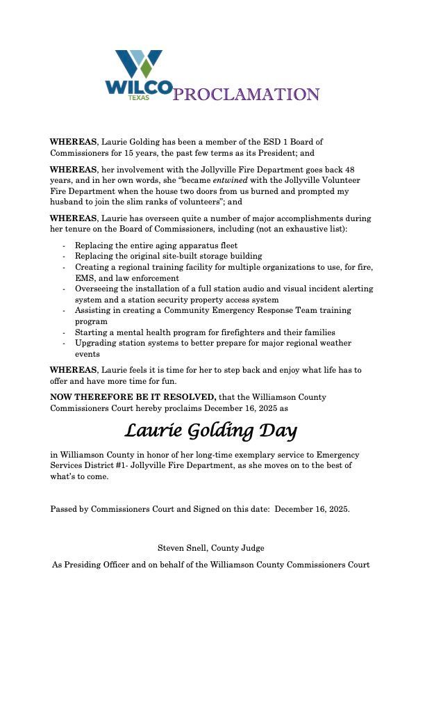 The Williamson County Emergency Services District No. 1 Board of Commissioners wishes to inform residents that Brad Landi has resigned from the position of Fire Chief of the Jollyville Fire Department effective February 23, 2026. We wish him the best in all future endeavors. Emergency and Fire services will continue without interruption, and interim leadership arrangements are already in place to ensure public safety remains the top priority of the Emergency Service District and the Jollyville Fire Department.